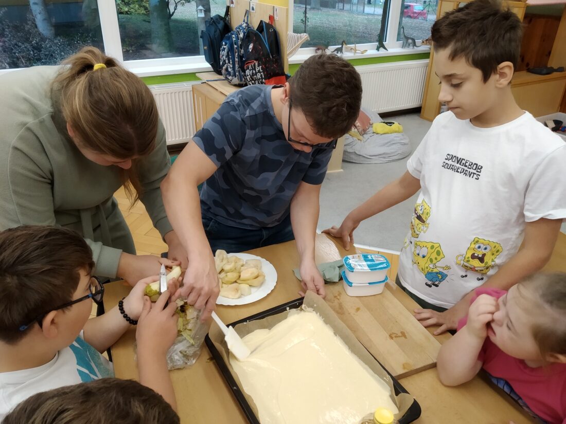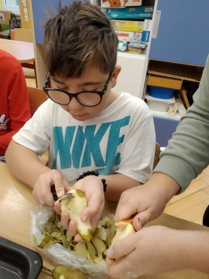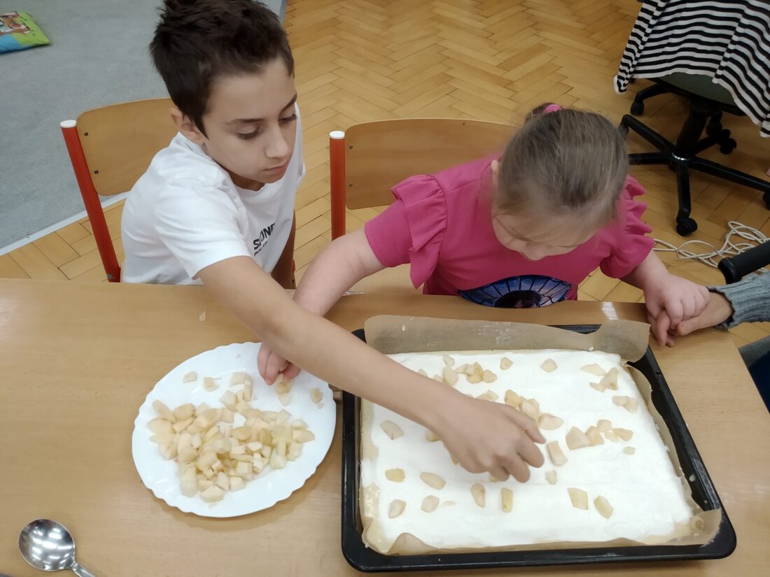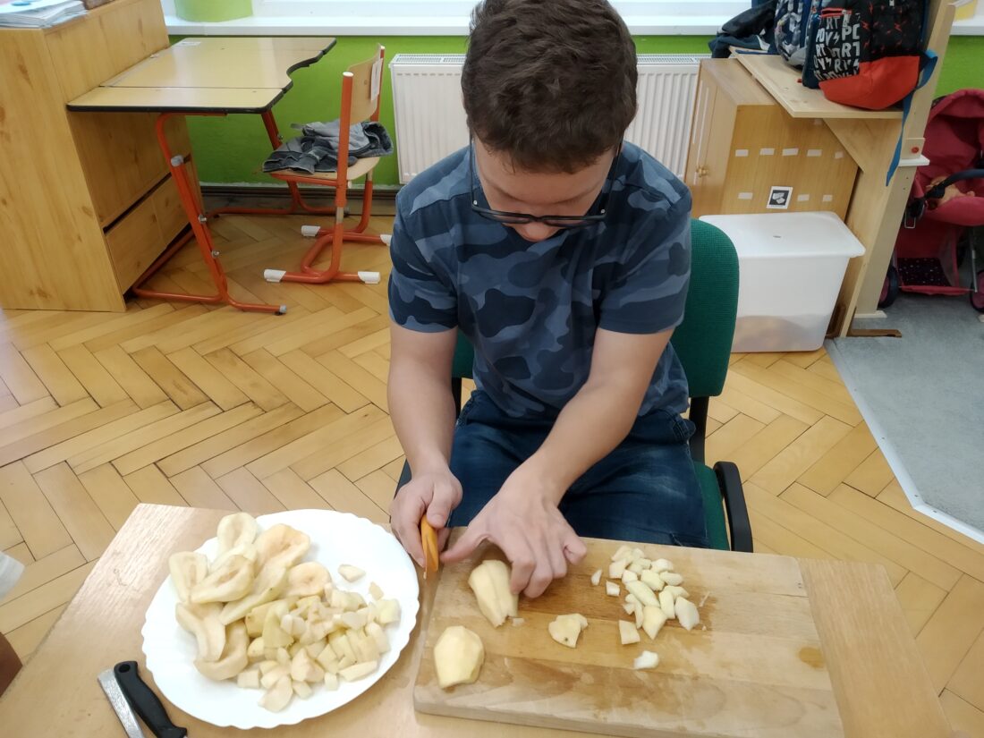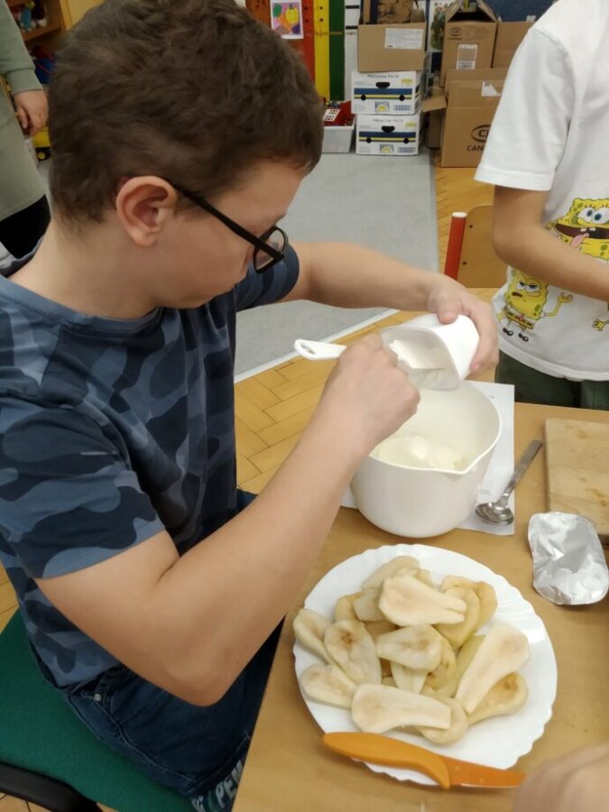 Podzim přináší bohatou sklizeň ovoce, zeleniny a plodů z přírody. Je radost z nich společně něco vytvořit. Naši malí kuchaři ze IV.C si během října vyzkoušeli hned dva recepty. Jedním bylo vaření Ovocného kompotu. Krájení ovoce na malé kousky dalo žákům docela zabrat, ale odměna byla sladká. Druhou výzvou bylo pečení Hruškového koláče, kde se ke krájení přidalo i loupání a míchání ingrediencí. Že se výsledky povedly, potvrdily jejich spokojená bříška 😊.