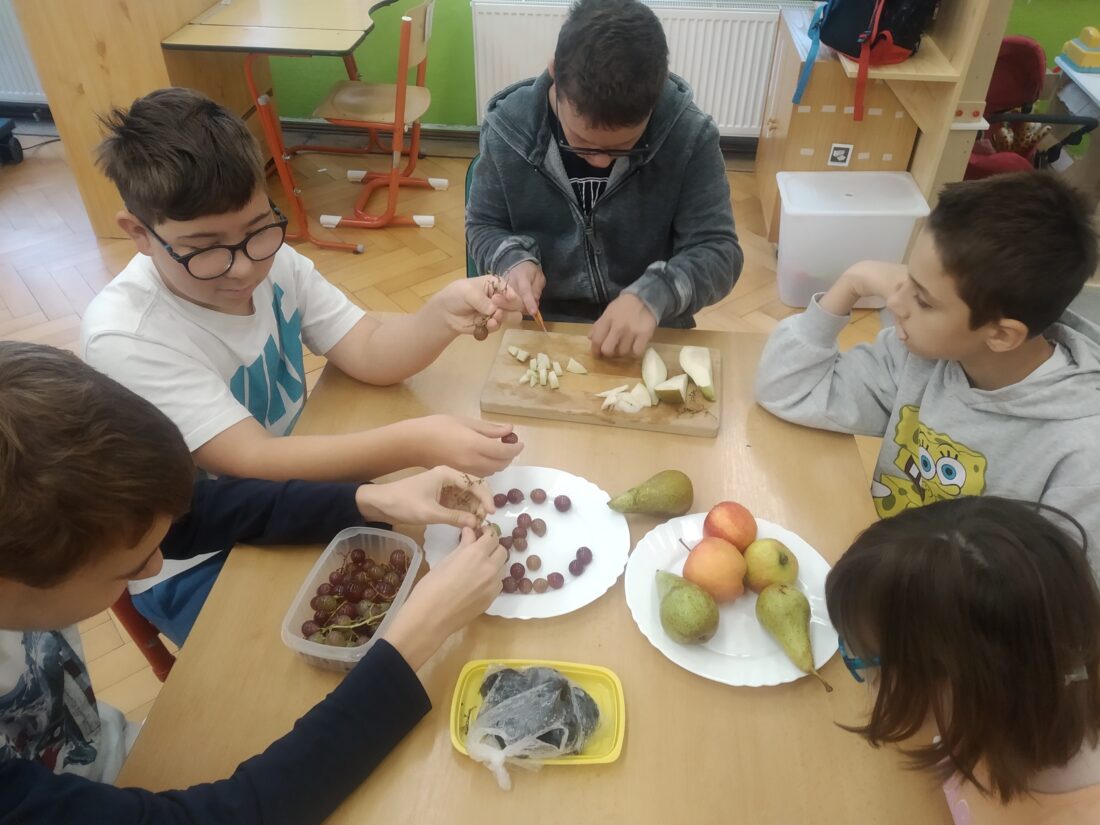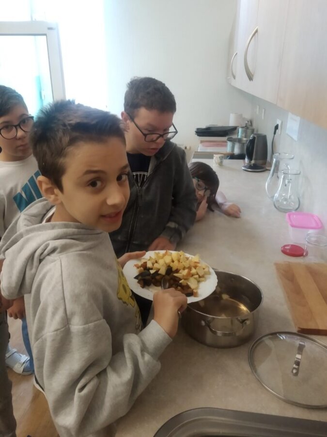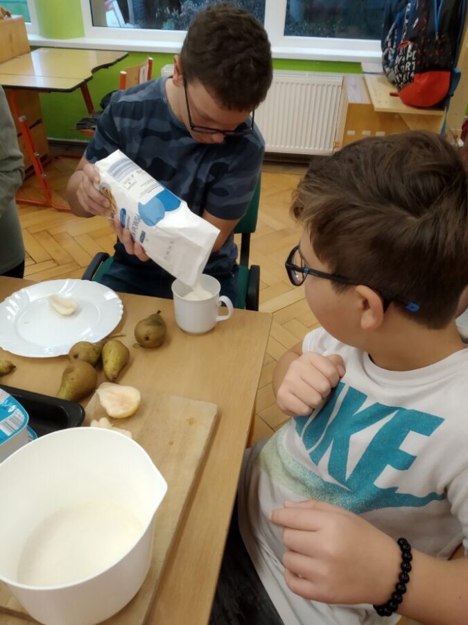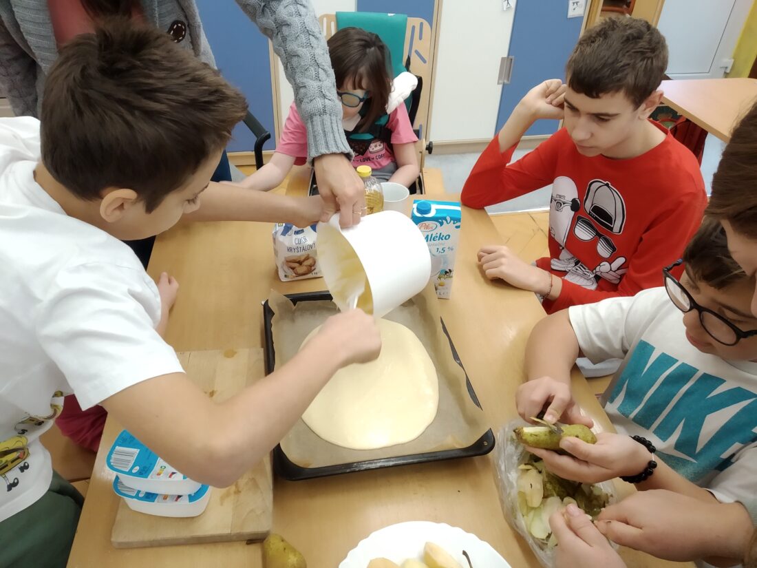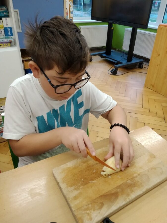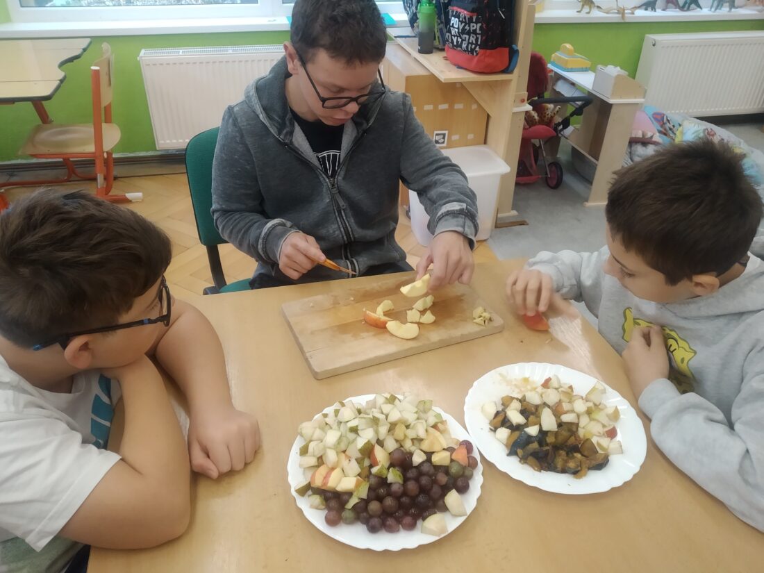 Podzim přináší bohatou sklizeň ovoce, zeleniny a plodů z přírody. Je radost z nich společně něco vytvořit. Naši malí kuchaři ze IV.C si během října vyzkoušeli hned dva recepty. Jedním bylo vaření Ovocného kompotu. Krájení ovoce na malé kousky dalo žákům docela zabrat, ale odměna byla sladká. Druhou výzvou bylo pečení Hruškového koláče, kde se ke krájení přidalo i loupání a míchání ingrediencí. Že se výsledky povedly, potvrdily jejich spokojená bříška 😊.