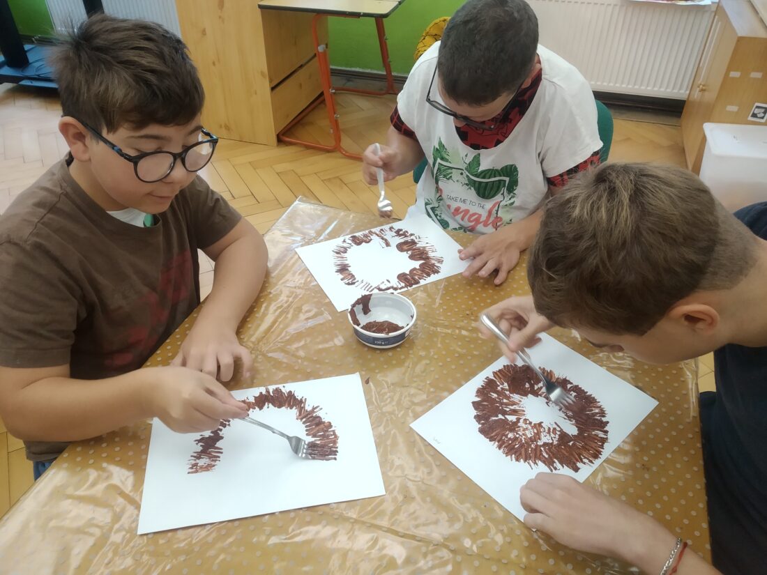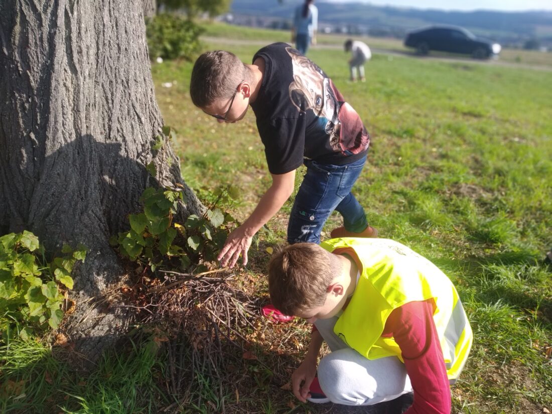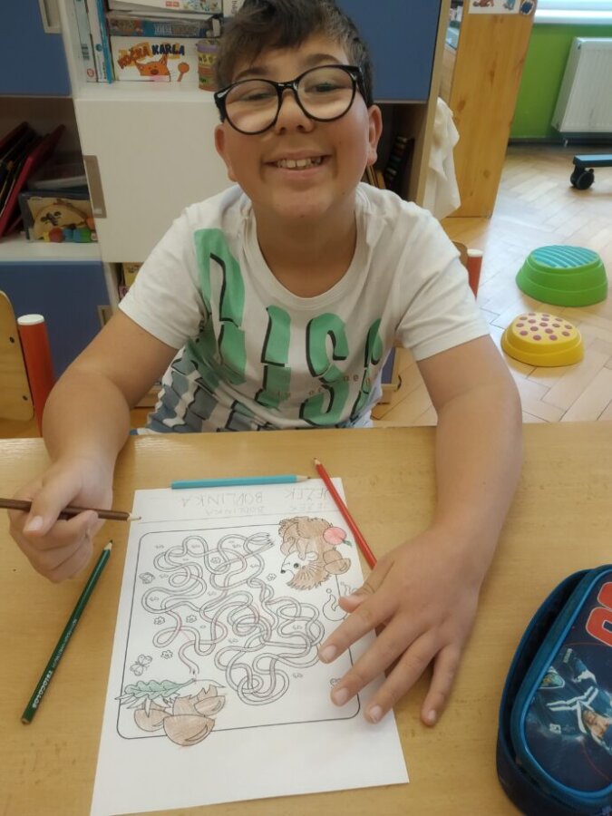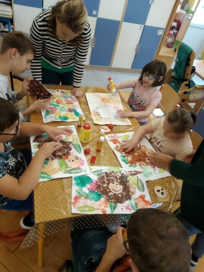Žáci se naučili novou písničku a báseň o ježečkovi. Téma zpracovali také výtvarně a za pomoci pracovních listů. Nechyběly ani pohybové aktivity ve třídě, ve kterých žáci museli překonat překážky, aby se ježeček dostal do domečku. Téma Podzim s ježečkem jsme využili také venku a za krásného počasí vyrazili do terénu do polí nad Lanškrounem.  Využili jsme klacíky a listy ke stavbě domečku pro malá zvířátka. Z přírodnin jsme vytvořili pár písmen, na které žáci vymýšleli slova. Cestou jsme objevili pár zajímavostí jako například housenku štětconoše ořechového nebo otisk veliké psí stopy v bahně. Živého ježečka jsme neobjevili, tak třeba zase příště 🙂.
