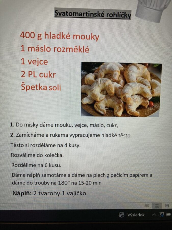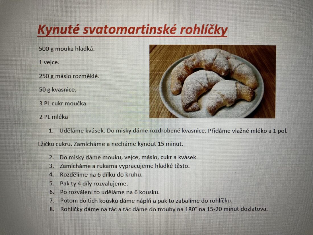 Projekt „Svatý Martin“ – Svatý Martin na bílém koni navštívil také naši třídu (7., 8., 9.ročník). Přicválal ve výtvarné výchově, propočítal nákup v matematice, napekl v pracovních činnostech, vymyslel a sepsal postup receptu v českém jazyce a vytvořil ukázkový recept na Svatomartinské rohlíčky v informatice. Návštěvu ukončil ochutnávkou napečených rohlíčků.